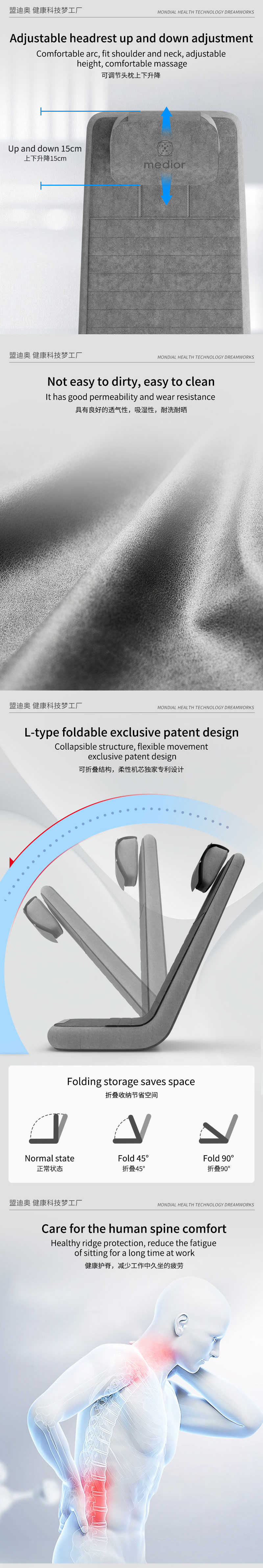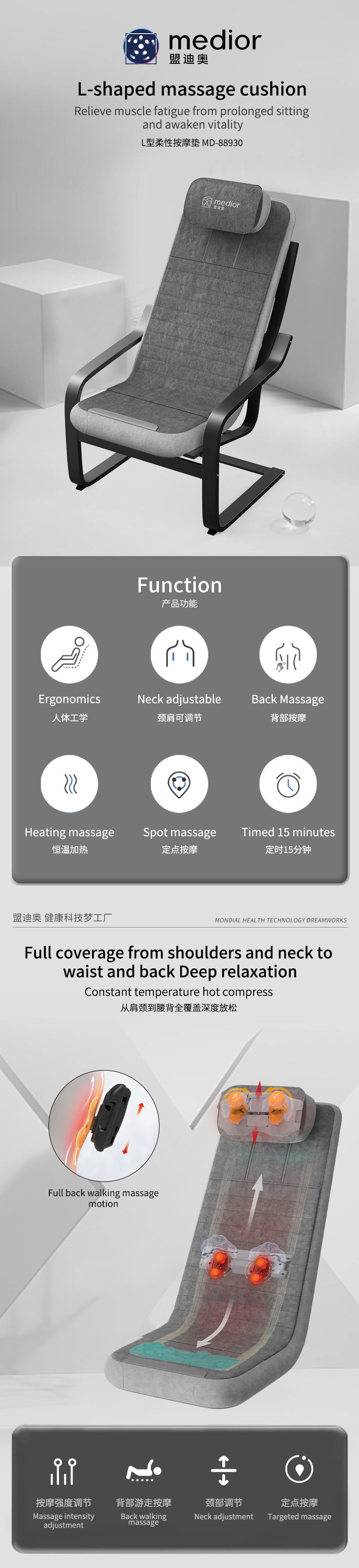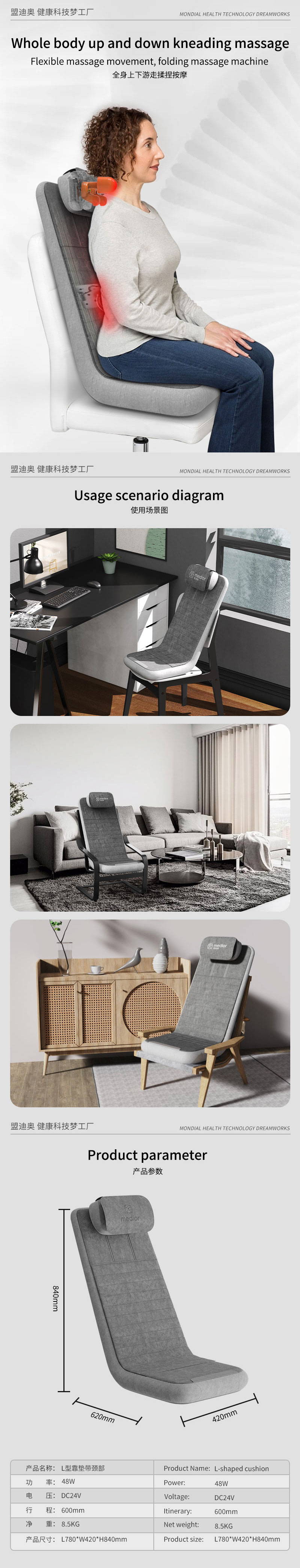 1、L型機芯結構,對折包裝縮小體積2、獨家專利柔性機芯3、力度三檔調節(jié),定點按摩,腰背按摩、臀腿按摩、全背按摩模式選擇4、背部行走揉捏,按摩區(qū)域加長到從肩膀到大腿;5、更加貼合不同款式的椅子整體可對折收納
