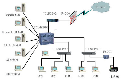 在該方案中,通過Tcl R3105路由器,用戶以Adsl或Cable方式接入Internet,未開通Adsl的地方可采用Isdn方式方案的特點是結構簡單,內部局域網可以采用全交換方式,實現百兆交換到桌面。另外也可以采用集線器組網。
