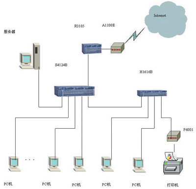 SOHO是Small office home office的簡稱,這類網絡用戶數量較少且相對集中,網絡布線采用雙絞線即可。一般而言,SOHO級企業(yè)對網絡的要求不高,基本實現以下功能即可:實現企業(yè)內資源共享,無紙辦公,提供管理應用系統(tǒng),實現企業(yè)辦公自動化,能夠接入Internet,收發(fā)E-mail,共享Internet資源。網絡拓撲如上圖所示。