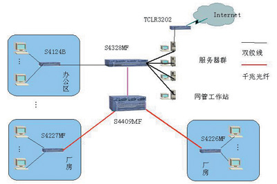在該方案中,企業(yè)各部門通過千兆光纖連接,為避免帶寬的浪費,局域網內部劃分出不同的VLAN,網絡中心采用三層交換機解決VLAN之間的通信。